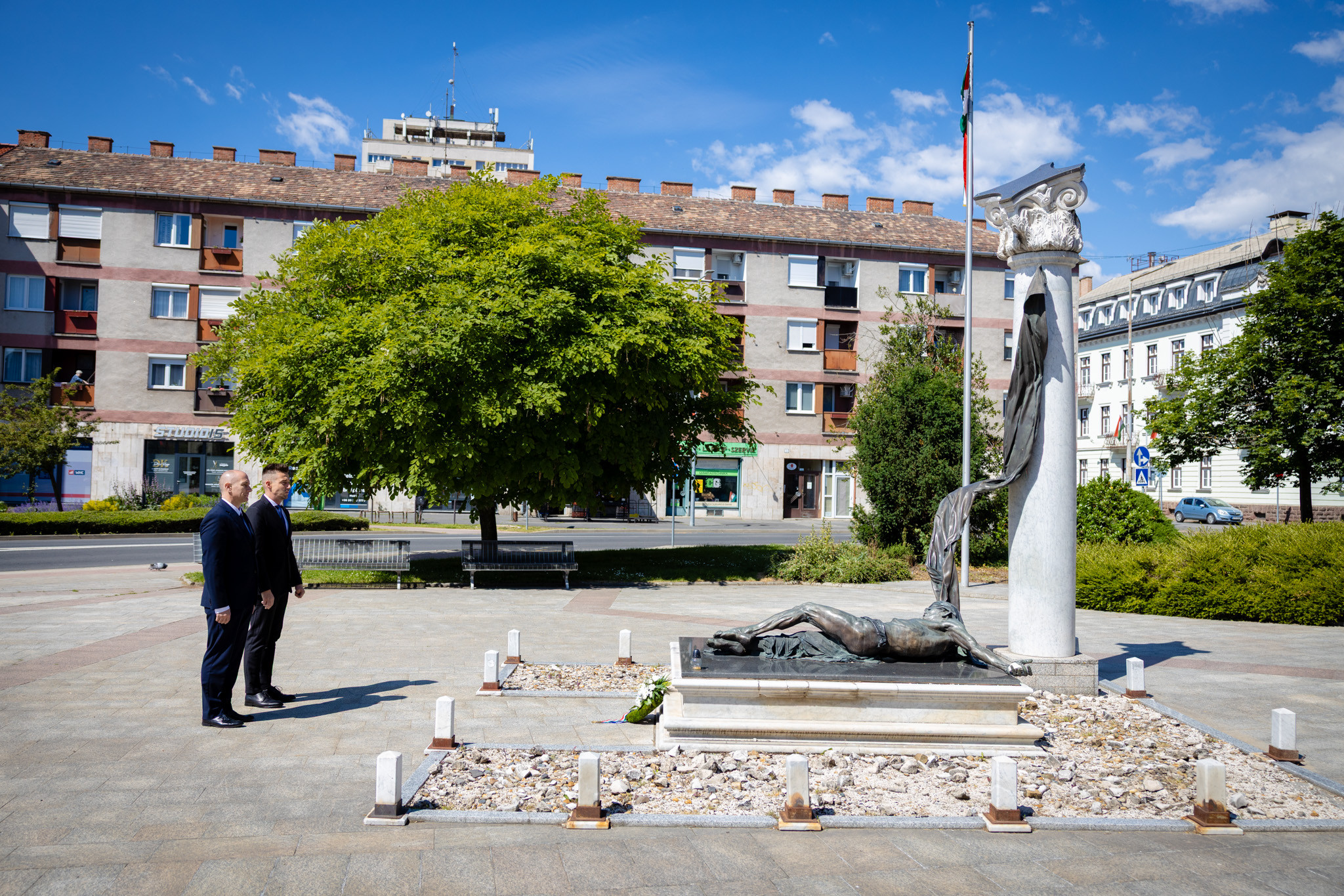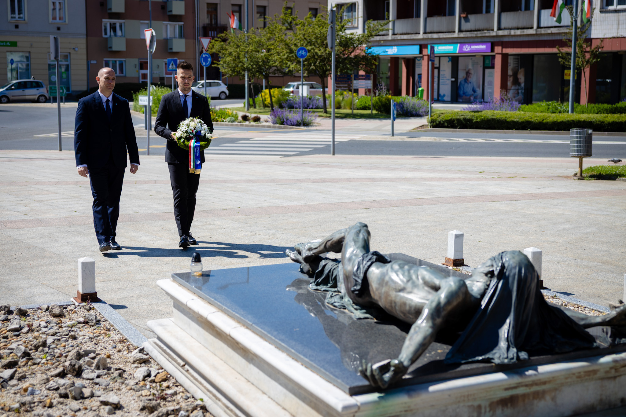 Az ünnepi megemlékezést megelőzően Horváth Soma alpolgármester és Kelemen Krisztián tanácsnok koszorút helyezett el a Március 15. téri emlékműnél is.