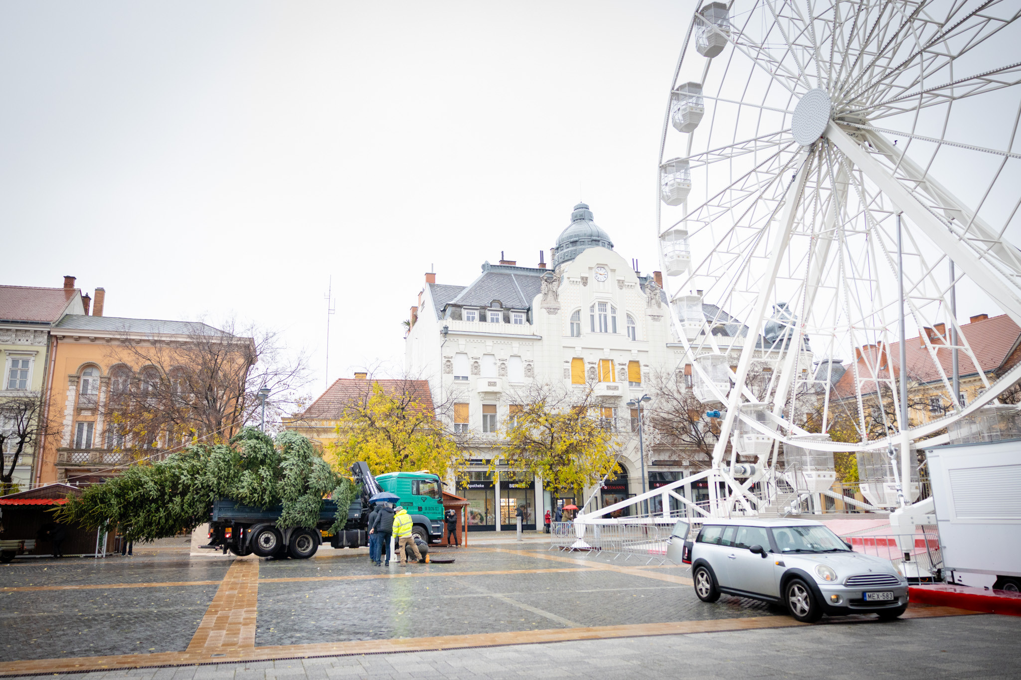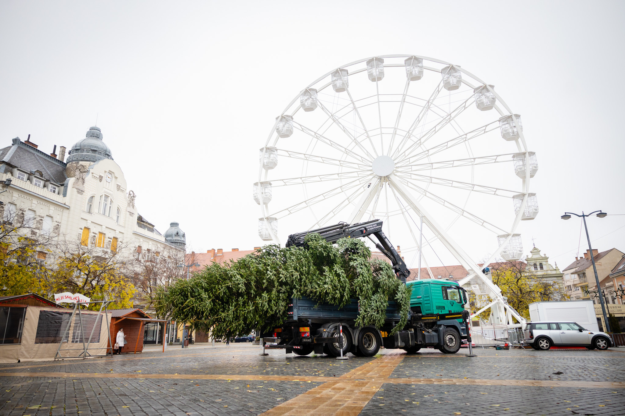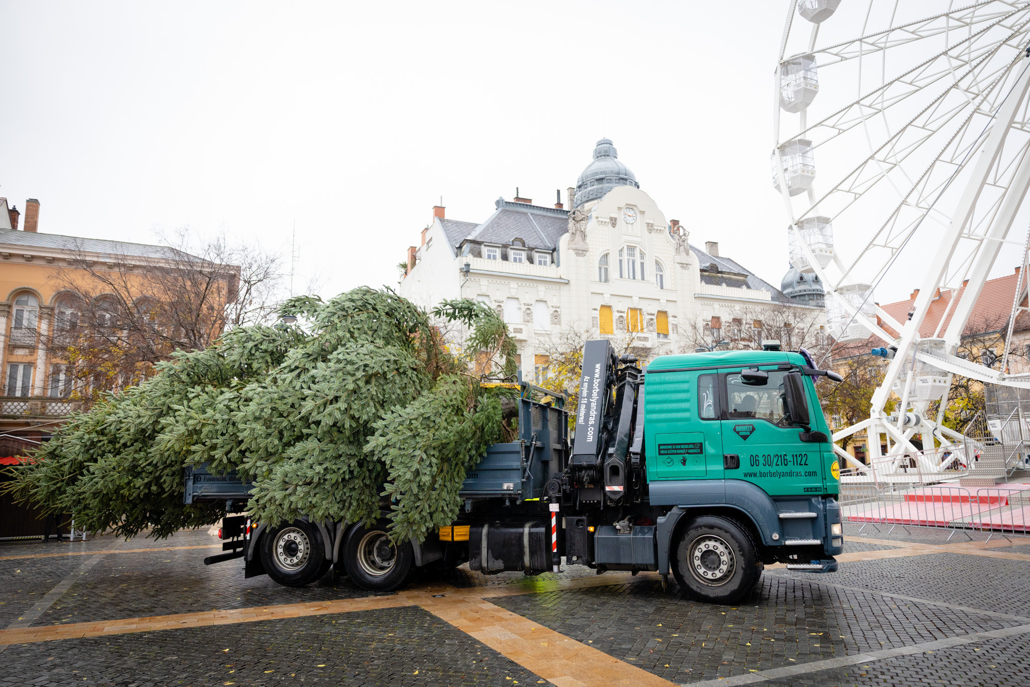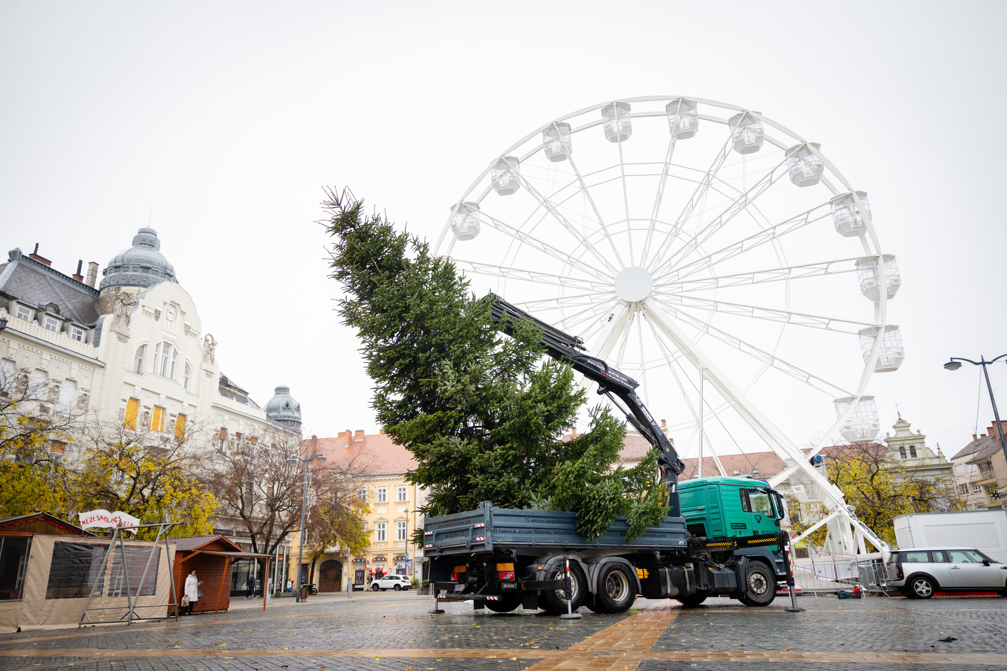 November 17-én reggel favágók daruval rögzítették a hatalmas fát, elvágták a törzsét, majd a platóra emelték, és lekötözték, aztán a szokásos helyére került a város karácsonyfája, ám előbb méretre faragták a törzsét, hogy beférjen a tartóba. A fát a helyére emelték, rögzítették, és hamarosan feldíszítik. Az adventi vásár hivatalos megnyitója november 21-én 17 órakor kezdődik. Akkortól mindenki teljes karácsonyi pompájában láthatja a Péterffy Sándor utca egykori díszét.