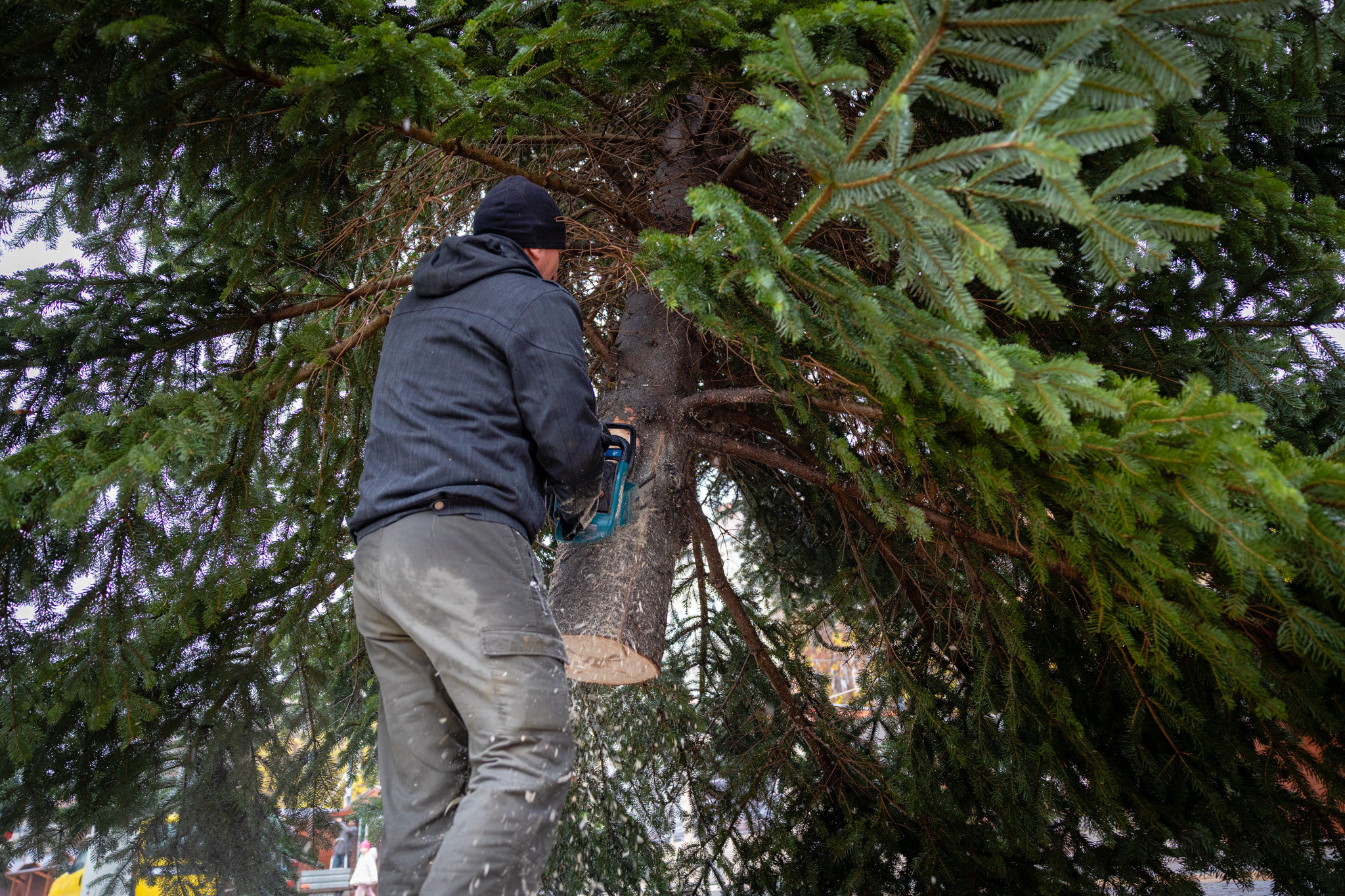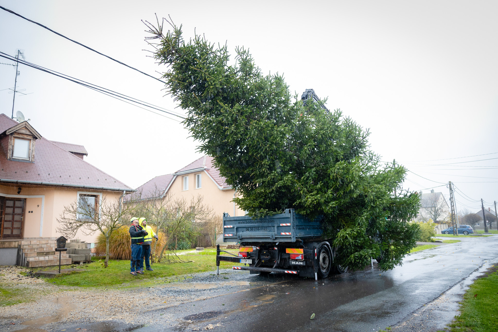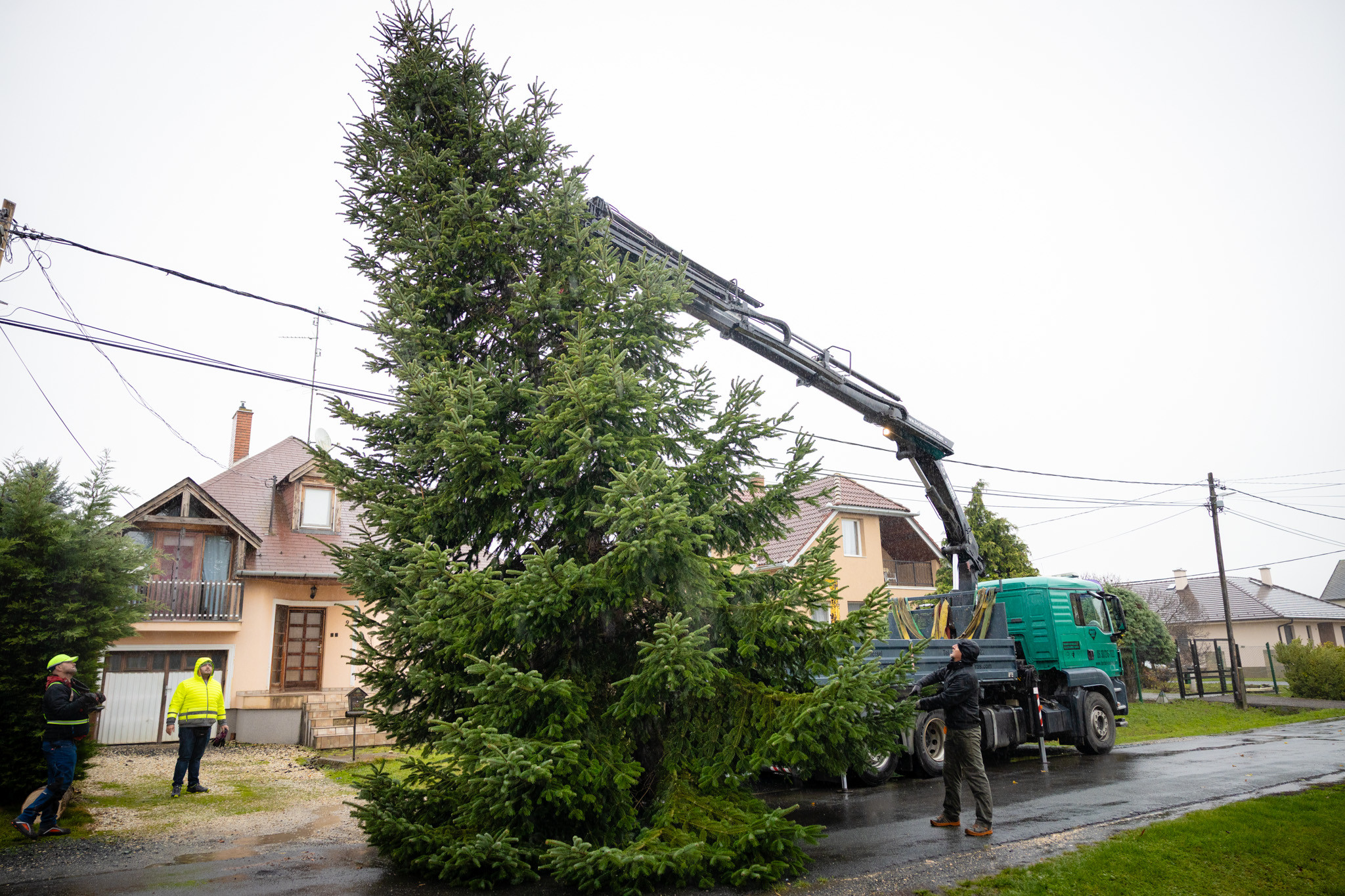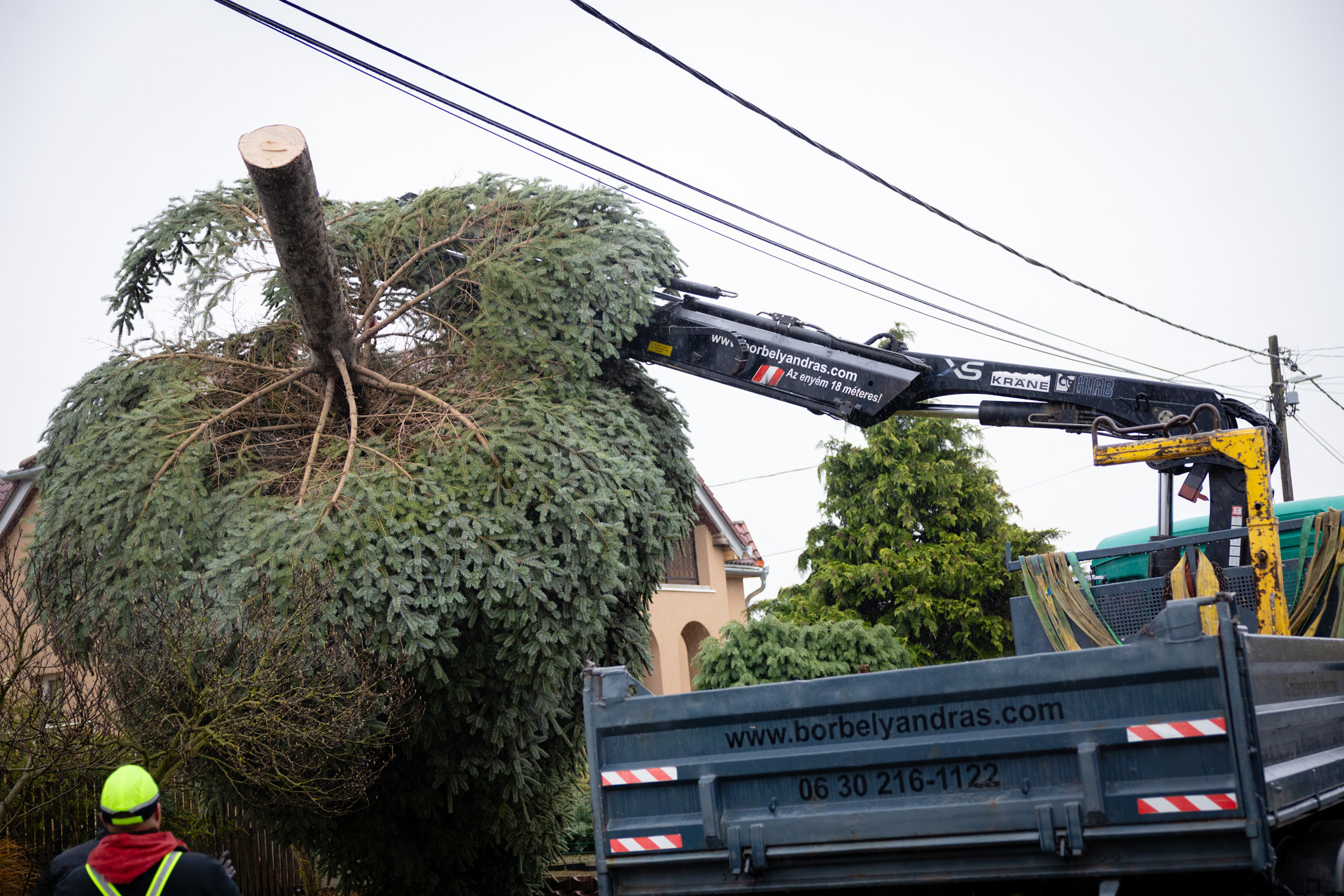 November 17-én reggel favágók daruval rögzítették a hatalmas fát, elvágták a törzsét, majd a platóra emelték, és lekötözték, aztán a szokásos helyére került a város karácsonyfája, ám előbb méretre faragták a törzsét, hogy beférjen a tartóba. A fát a helyére emelték, rögzítették, és hamarosan feldíszítik. Az adventi vásár hivatalos megnyitója november 21-én 17 órakor kezdődik. Akkortól mindenki teljes karácsonyi pompájában láthatja a Péterffy Sándor utca egykori díszét.