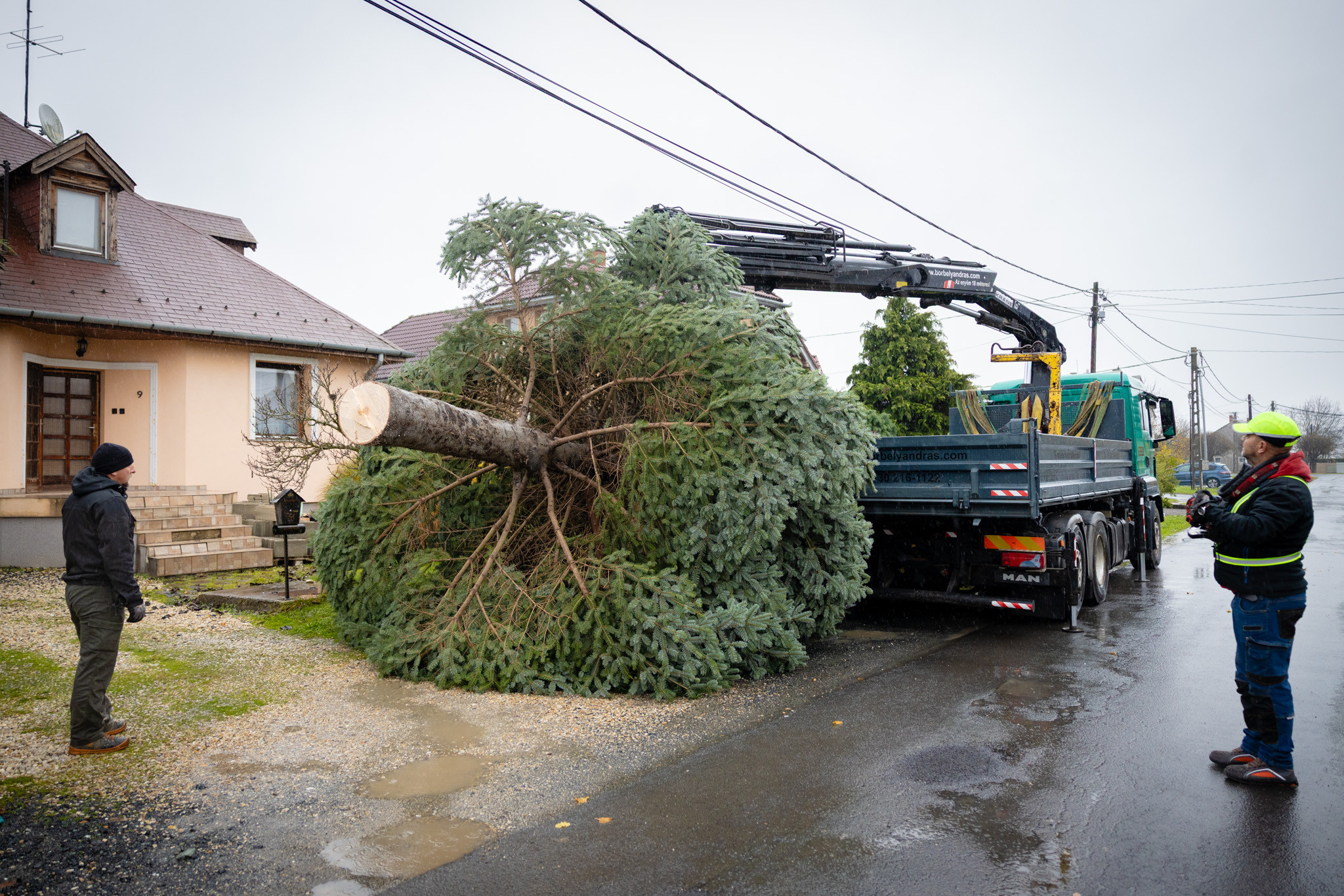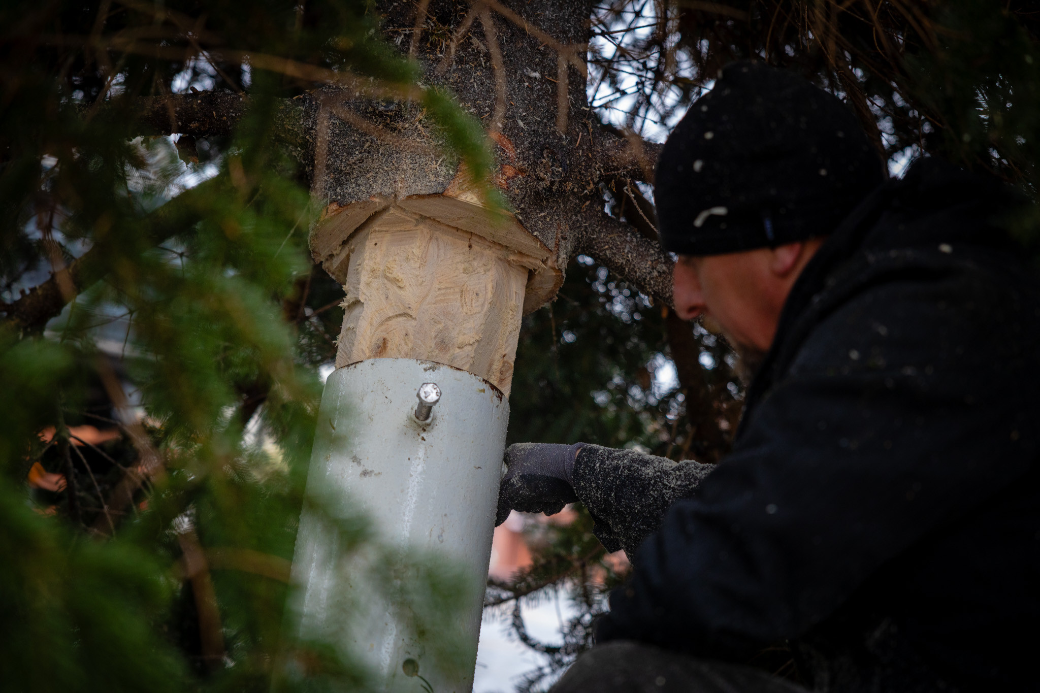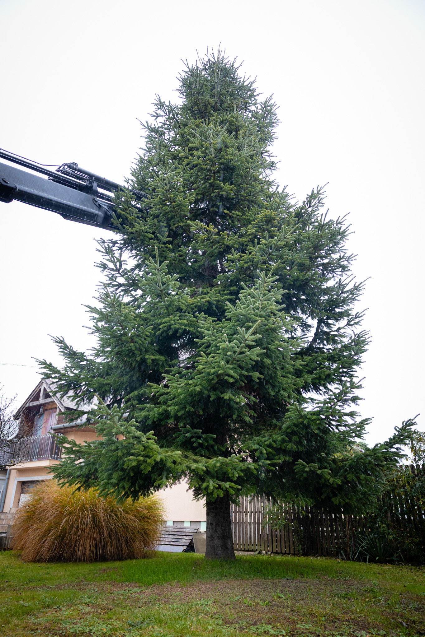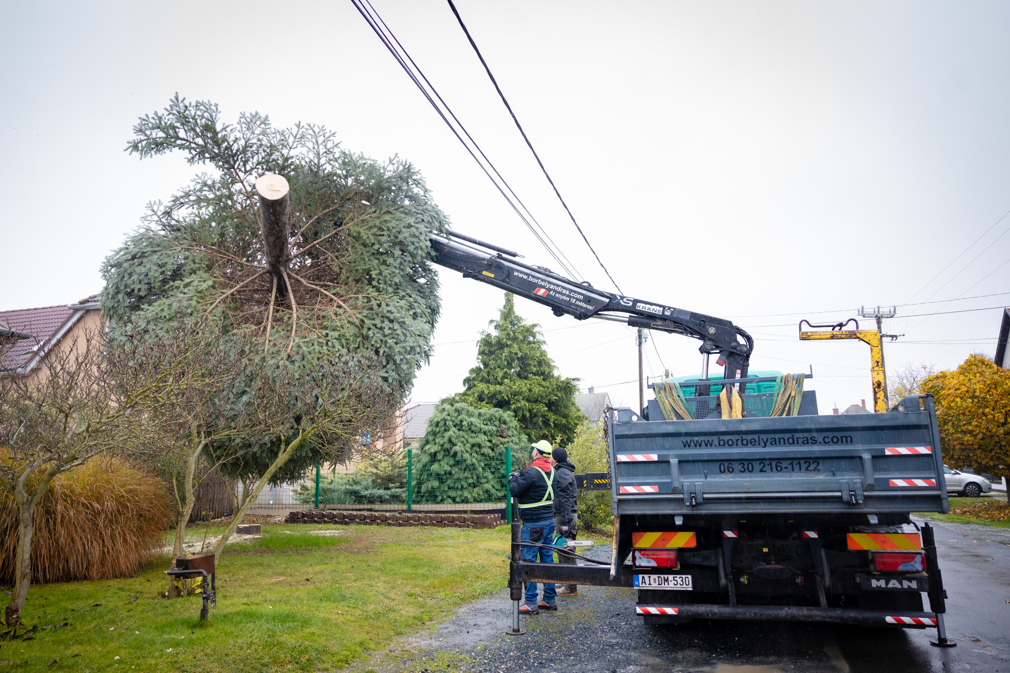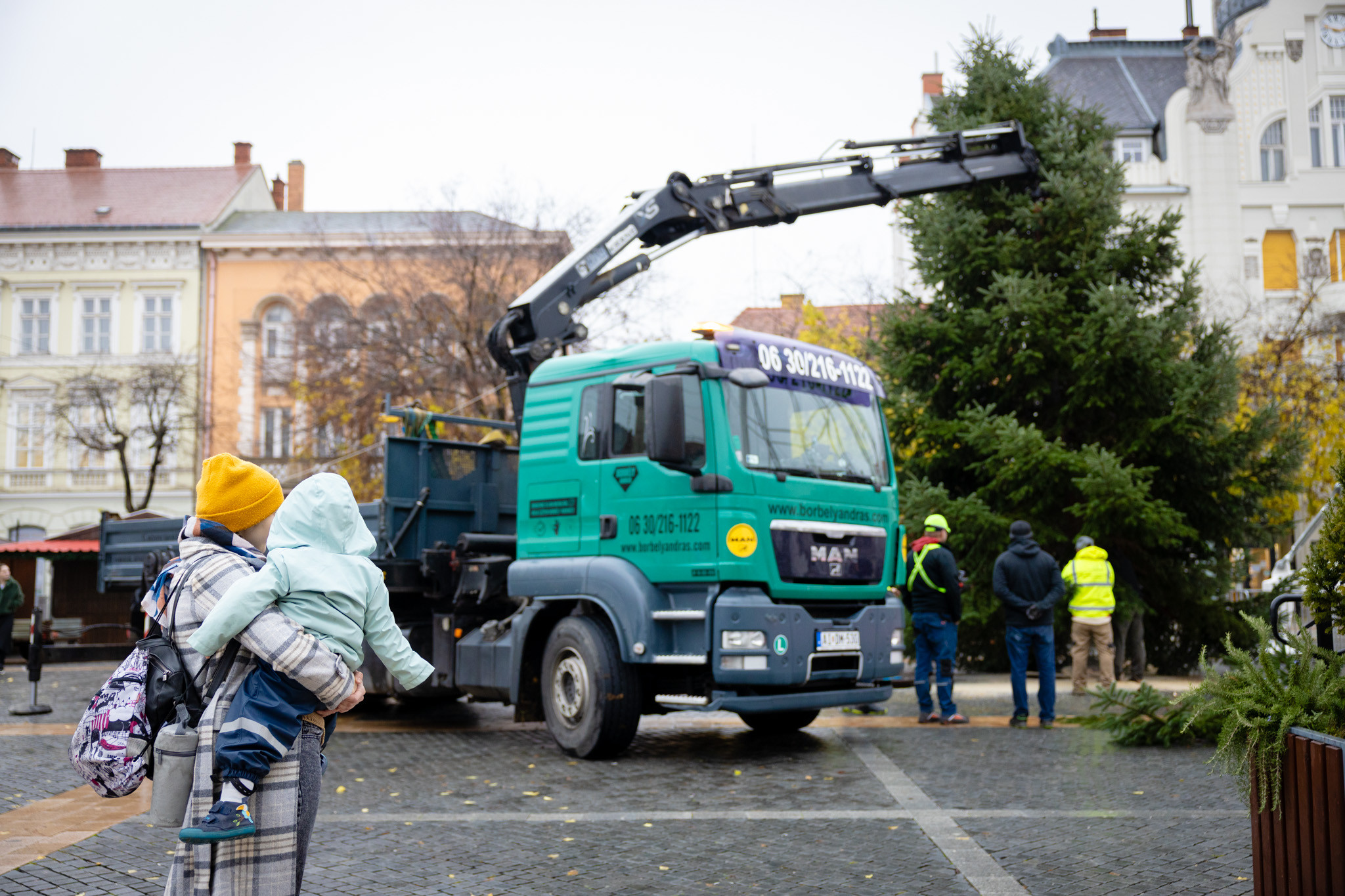 November 17-én reggel favágók daruval rögzítették a hatalmas fát, elvágták a törzsét, majd a platóra emelték, és lekötözték, aztán a szokásos helyére került a város karácsonyfája, ám előbb méretre faragták a törzsét, hogy beférjen a tartóba. A fát a helyére emelték, rögzítették, és hamarosan feldíszítik. Az adventi vásár hivatalos megnyitója november 21-én 17 órakor kezdődik. Akkortól mindenki teljes karácsonyi pompájában láthatja a Péterffy Sándor utca egykori díszét.