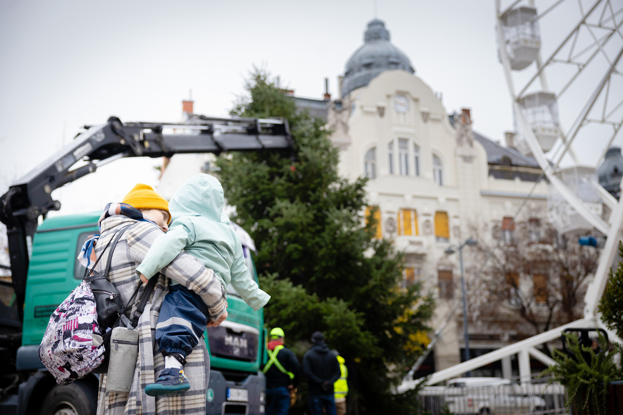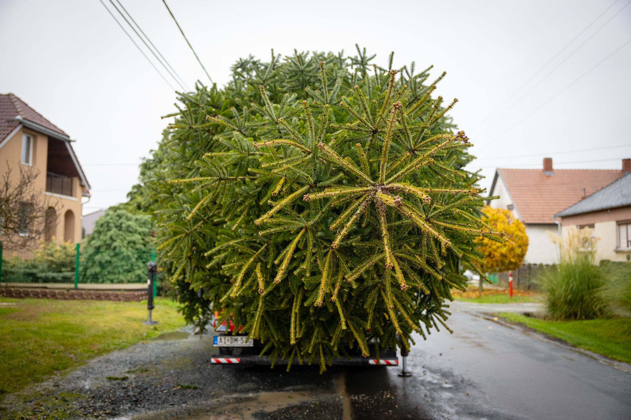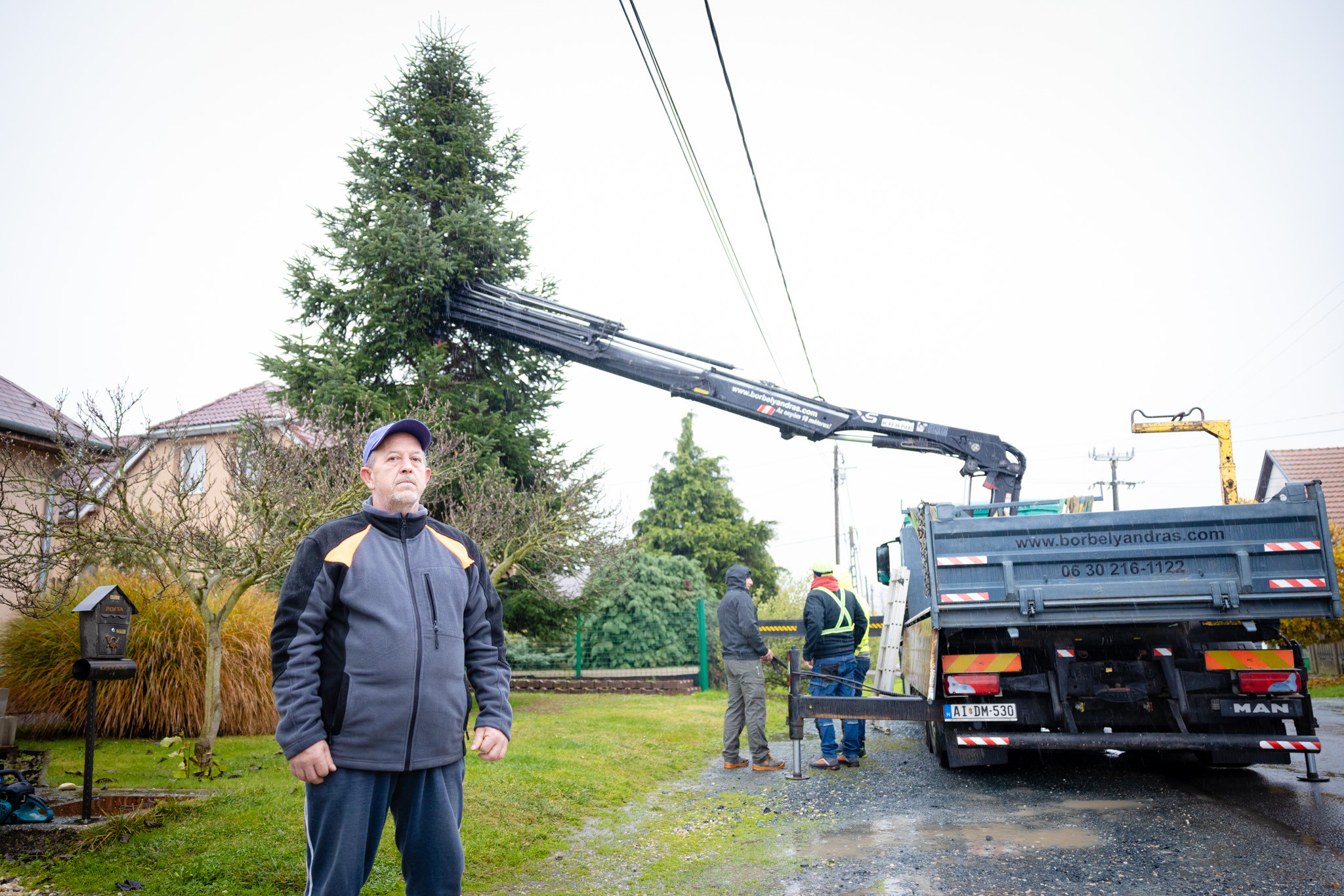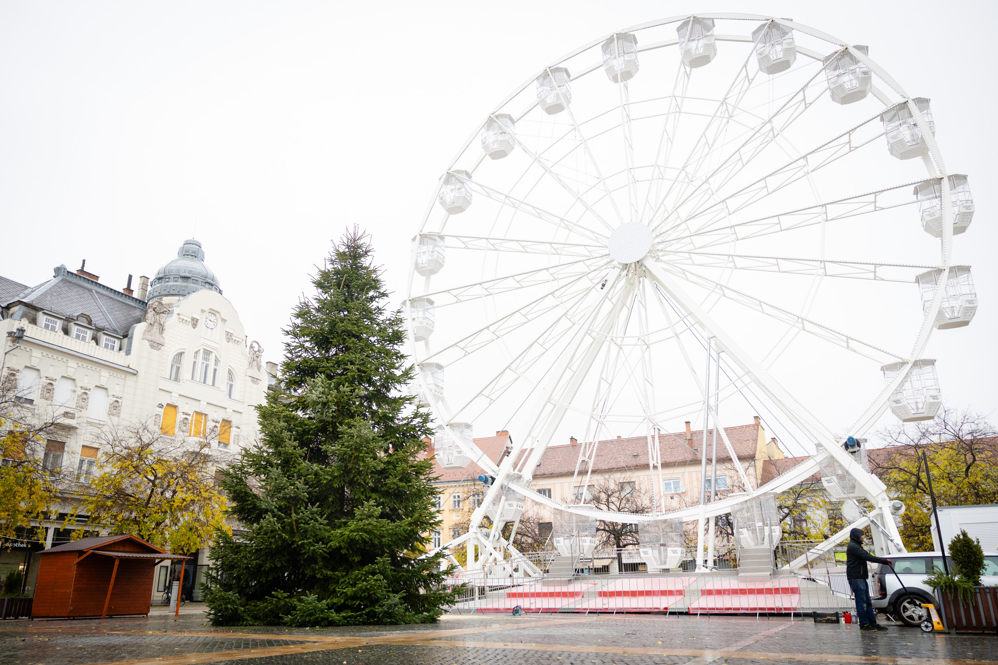 November 17-én reggel favágók daruval rögzítették a hatalmas fát, elvágták a törzsét, majd a platóra emelték, és lekötözték, aztán a szokásos helyére került a város karácsonyfája, ám előbb méretre faragták a törzsét, hogy beférjen a tartóba. A fát a helyére emelték, rögzítették, és hamarosan feldíszítik. Az adventi vásár hivatalos megnyitója november 21-én 17 órakor kezdődik. Akkortól mindenki teljes karácsonyi pompájában láthatja a Péterffy Sándor utca egykori díszét.