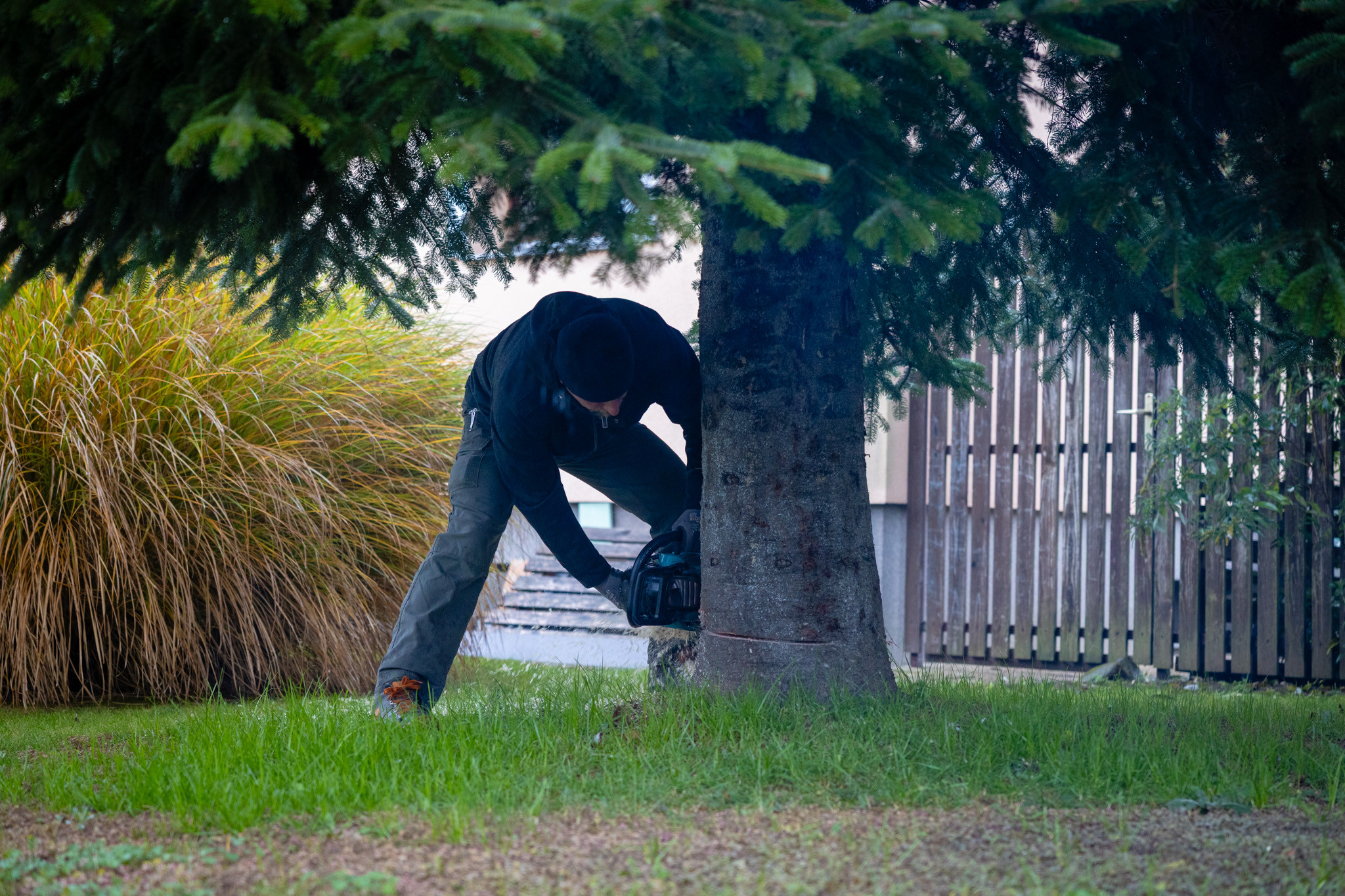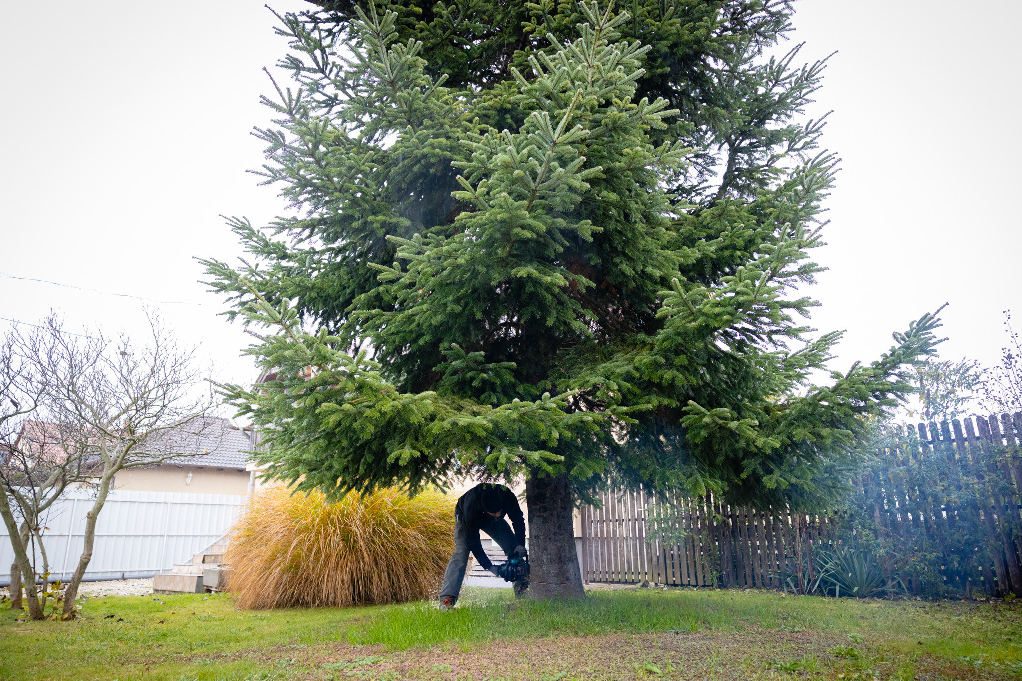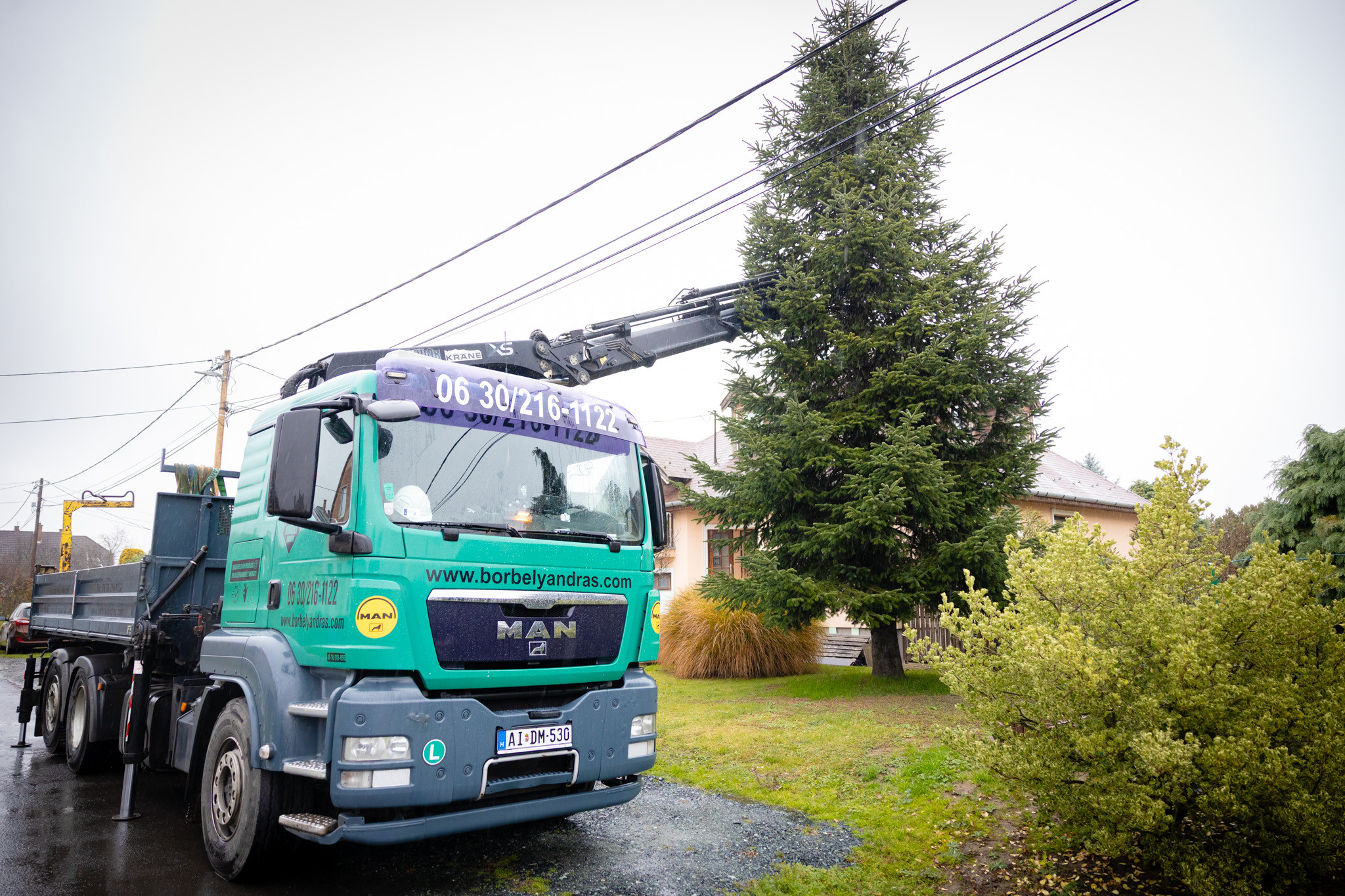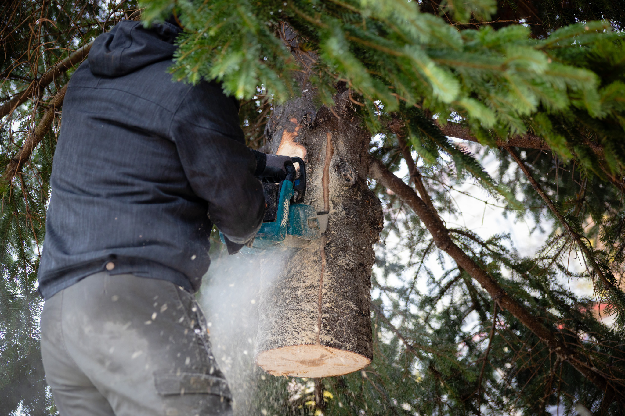 November 17-én reggel favágók daruval rögzítették a hatalmas fát, elvágták a törzsét, majd a platóra emelték, és lekötözték, aztán a szokásos helyére került a város karácsonyfája, ám előbb méretre faragták a törzsét, hogy beférjen a tartóba. A fát a helyére emelték, rögzítették, és hamarosan feldíszítik. Az adventi vásár hivatalos megnyitója november 21-én 17 órakor kezdődik. Akkortól mindenki teljes karácsonyi pompájában láthatja a Péterffy Sándor utca egykori díszét.